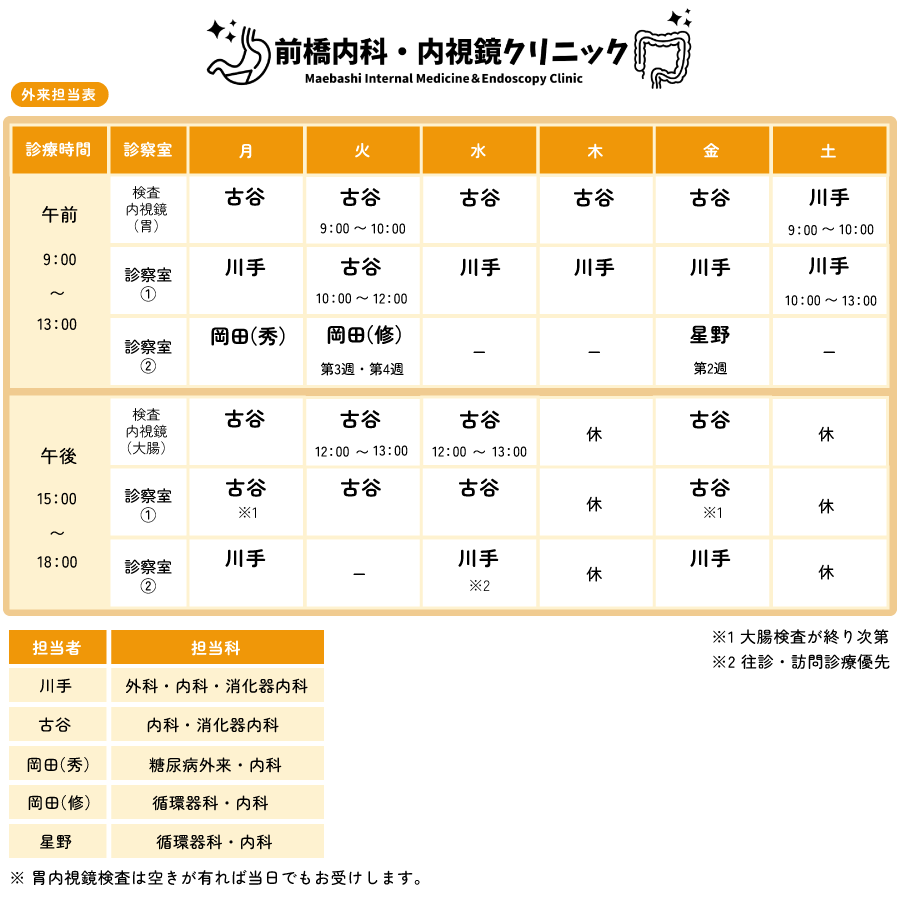 当院には総合内科専門医、消化器病専門医、消化器内視鏡専門医が在籍しており、幅広い疾患に対応可能です。